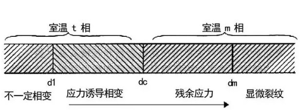 誘發(fā)顯維裂紋的臨界直徑dm。當d>dc的晶粒室溫下為m相,由于相變的體積效應,產生顯微裂紋或應力。d>dm的晶粒相變時,相變產生的積累變形大,誘發(fā)顯微裂紋。dc>d>dm的晶粒相變時,相變產生的積累變形小,不足誘發(fā)顯維裂紋,當其周圍存在殘余應力。