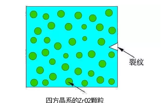 氧化鋯中四方相向單斜相的轉變可通過應力誘發(fā)產生。當材料受到外界拉應力時,基體對ZrO2的壓抑作用得到松弛,ZrO2顆粒即發(fā)生四方相到單斜相的轉變,這種相變將吸收能量而使裂紋尖端的應力場松弛,增加裂紋擴展阻力,從而大幅度提高陶瓷材料的韌性。