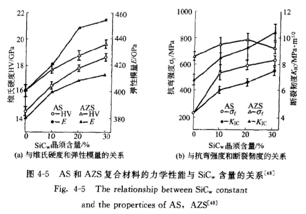 將兩種粉料分別配成分散良好的懸浮液,將兩種分散液混合,用瑪瑙球在QGM3-1輕型罐磨機聚氨酯磨罐中濕磨22h。混好的漿料用無水乙醇清洗3遍,然后在氮氣氣氛中0.93MPa下熱壓燒結,1650℃中保溫半小時?。周玉等人的制備工藝與之相似,試樣有AS和AZS材料,AZS材料中含有20%(體積分數(shù))2Y-ZrO2,AS材料中隨SiC含量從0增加到30%(體積分數(shù))[4圖4-5表明,AS材料的抗彎強度隨SiCw含量的增加而不斷提高,而且最初加入的10%(體積分數(shù))SiC、強化效果最為顯著而后增長緩慢慢。