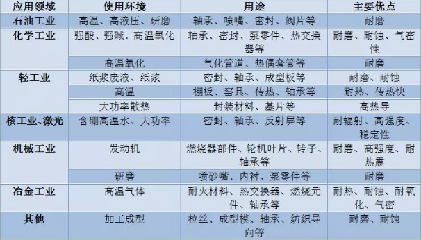 碳化硅以共價鍵為主,共價鍵約占88%。晶格的基本結(jié)構是互相穿插的SiC4和CSi4四面體。SiC具有α和β2種晶型,當溫度低于1600℃時,SiC以β-SiC形式存在,當高于1600℃時,β-SiC轉(zhuǎn)變?yōu)?amp;alpha;-SiC形式。碳化硅陶瓷在現(xiàn)代的工業(yè)中碳化硅起著不可或缺的作用。表1詳細地列出了其用途。