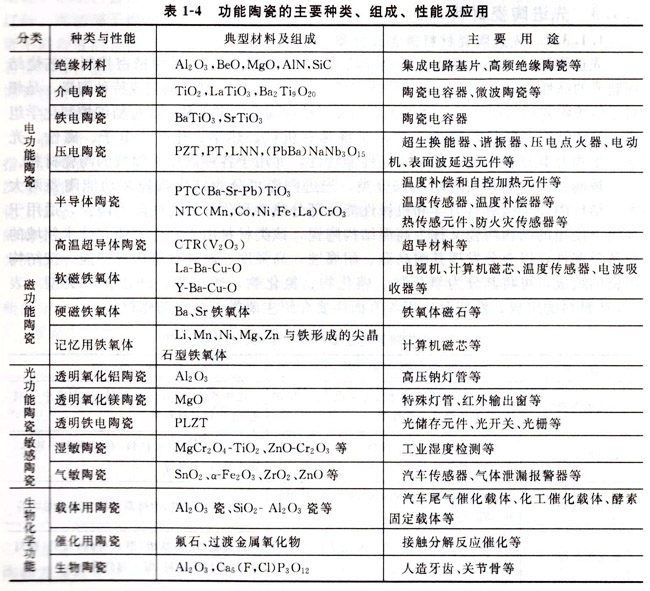 功能陶瓷是指以非力學(xué)性能(如電、磁、熱、化學(xué)、生物等性能)為主的陶瓷磚B=有些陶瓷材料既是結(jié)構(gòu)材料也是功能材料,如2r02、A12 03、SiC等。功能陶瓷制品具有品種多、應(yīng)用廣、更換頻繁、體積小、附加值高等特點(diǎn),主要有金屬氧化物和Ba、Pb、Mg及Sr的鈦酸鹽等,表1-4簡(jiǎn)要介紹幾種主要功能陶瓷。